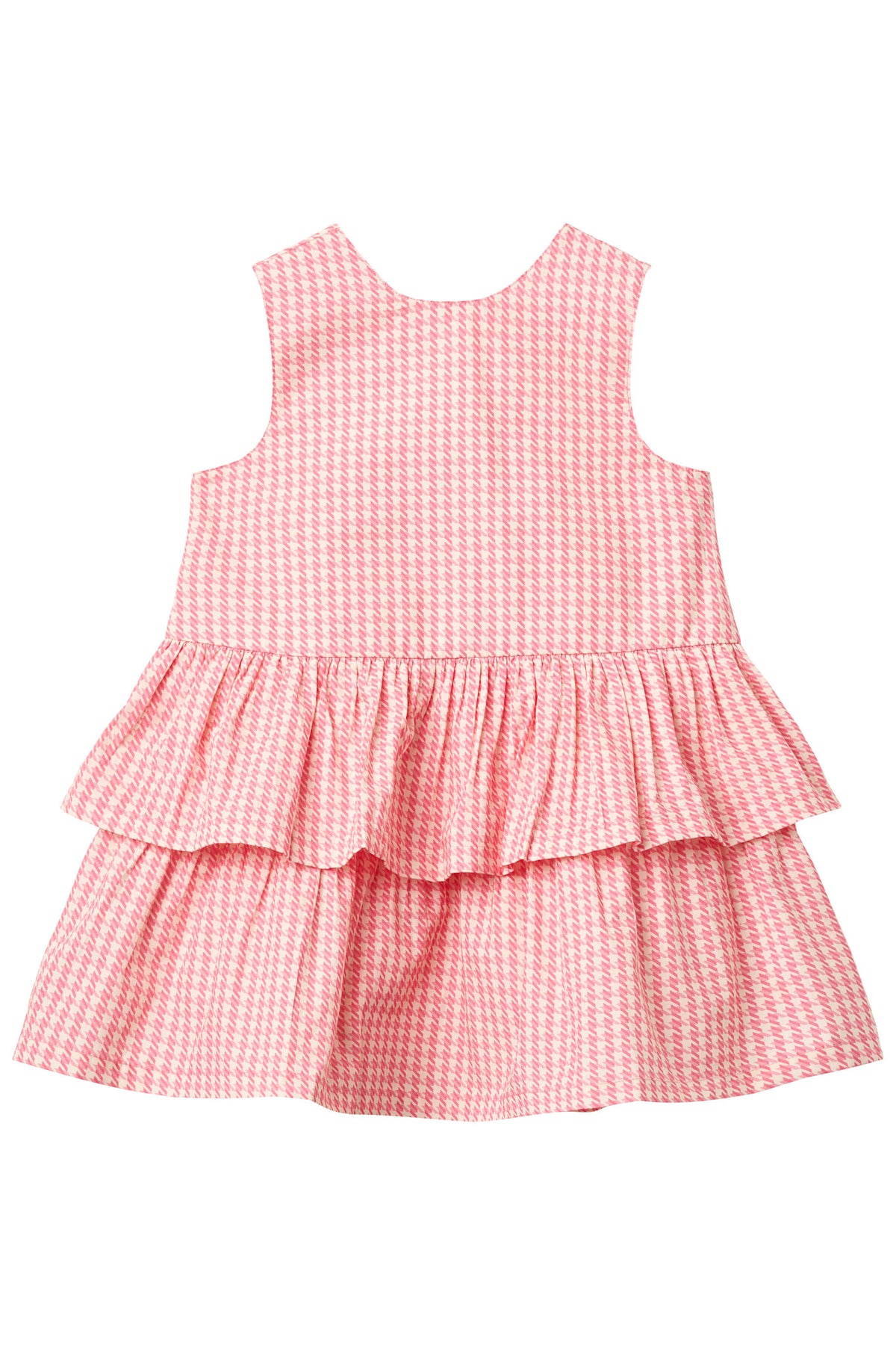 Charming and playful, this sleeveless dress is made from 100% GOTS-certified organic cotton, offering softness, comfort, and a beautiful drape. The houndstooth fabric gives it a timeless touch, while the layered ruffle skirt adds a fun, twirly silhouette. At the back, a statement bow completes the look with a sweet flourish, perfect for special occasions or everyday wear.