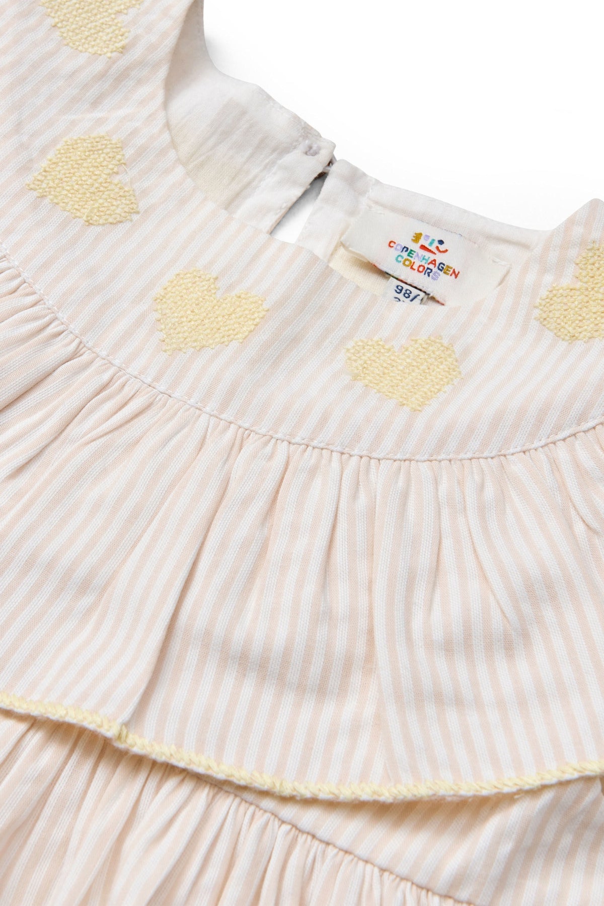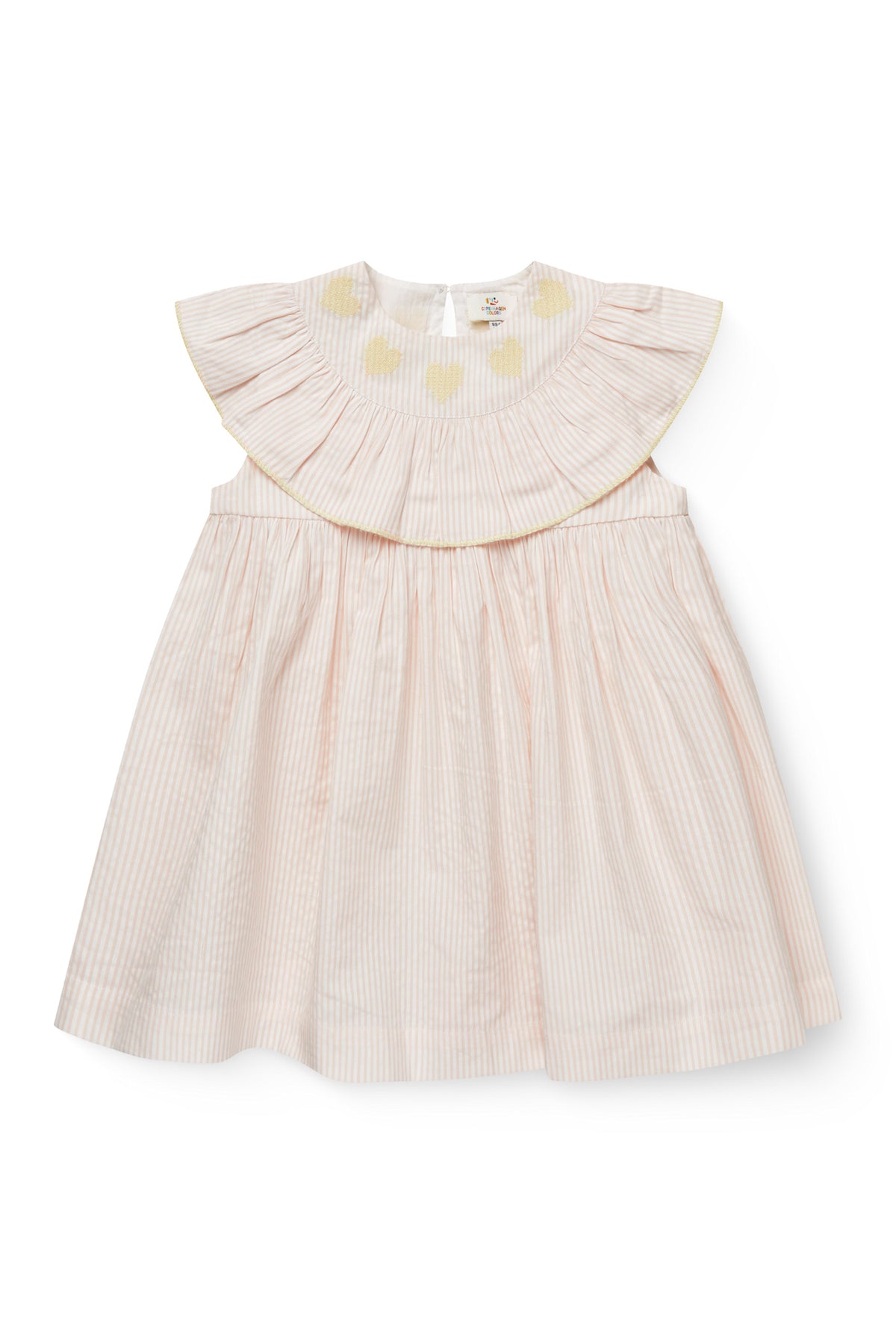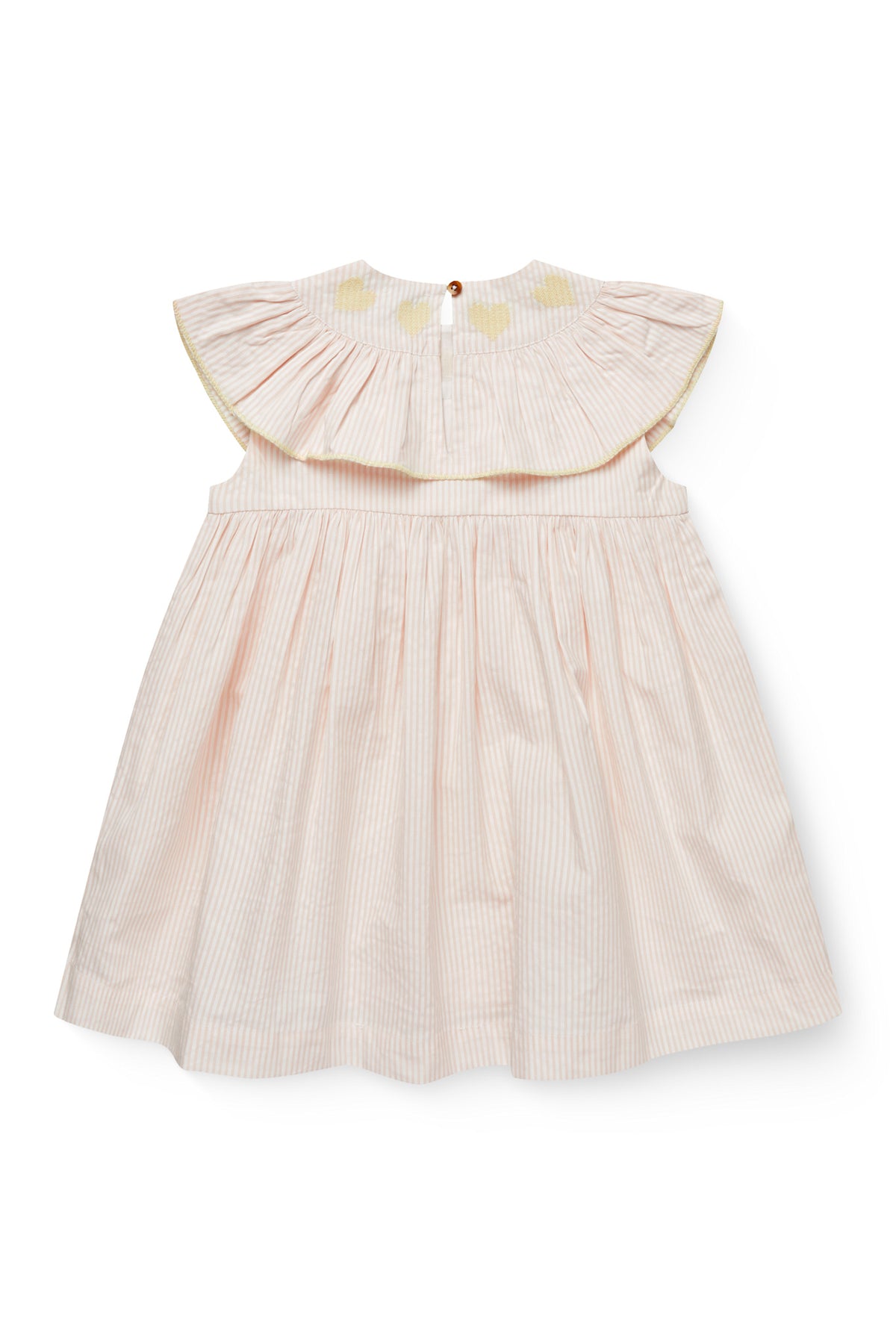 Dress up for limitless play with these irresistibly cute seersucker dresses featuring heart embroidery delicately placed at the frill collar. Crafted from 100% organic cotton, these dresses boast a woven seersucker fabric that is not only super soft but also uniquely adorned with small, classic stripes. Tailored for flexible and easy movement, they are designed to keep up with the active spirit of play. Wash the dress again and again at 30 degrees, and it will maintain their shape flawlessly. Bid farewell to lint concerns, and rest assured that the colors will resist fading. Elevate your little one's playtime wardrobe with these adorable and functional seersucker dresses designed for comfort and durability.