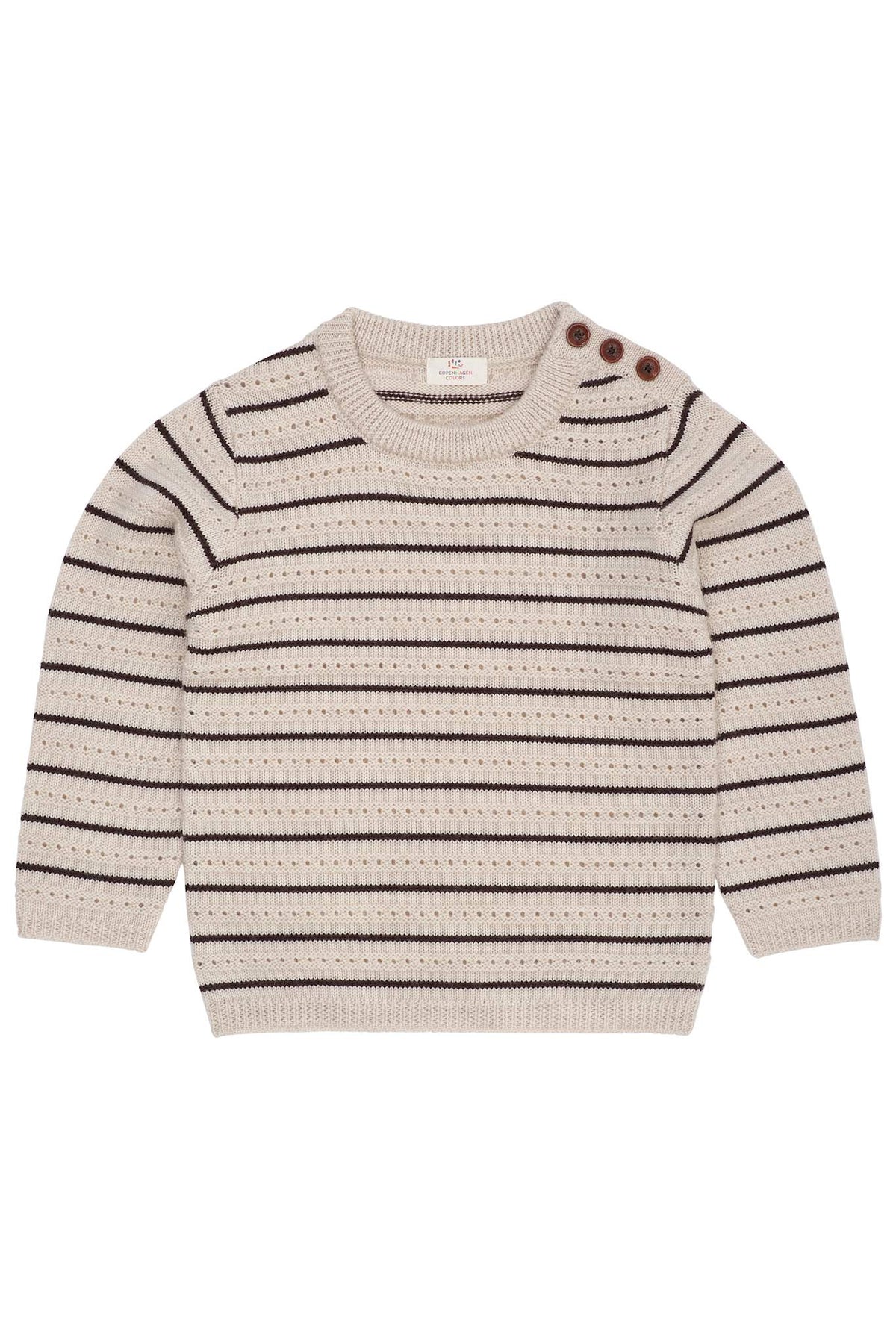 This knitted sweater has long sleeves and a round neck. The blouse has stribes and bottoms at the neck.