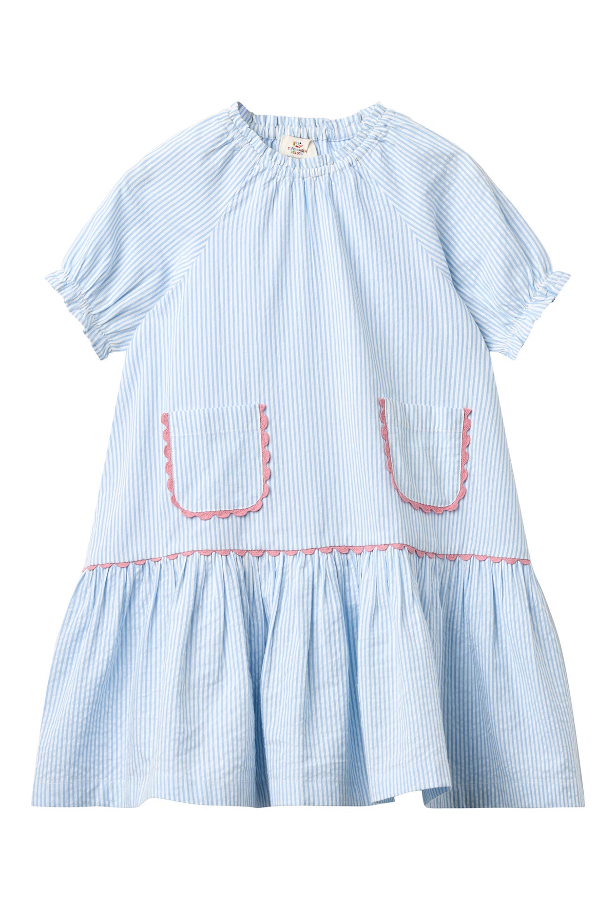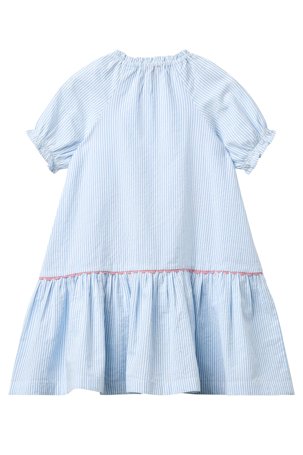 Playful yet classic, this sweet dress is made from 100% GOTS-certified organic cotton, ensuring softness, comfort, and breathability. The seersucker stripe fabric gives it a timeless feel, while the contrasting scalloped trim adds a delightful pop of color.