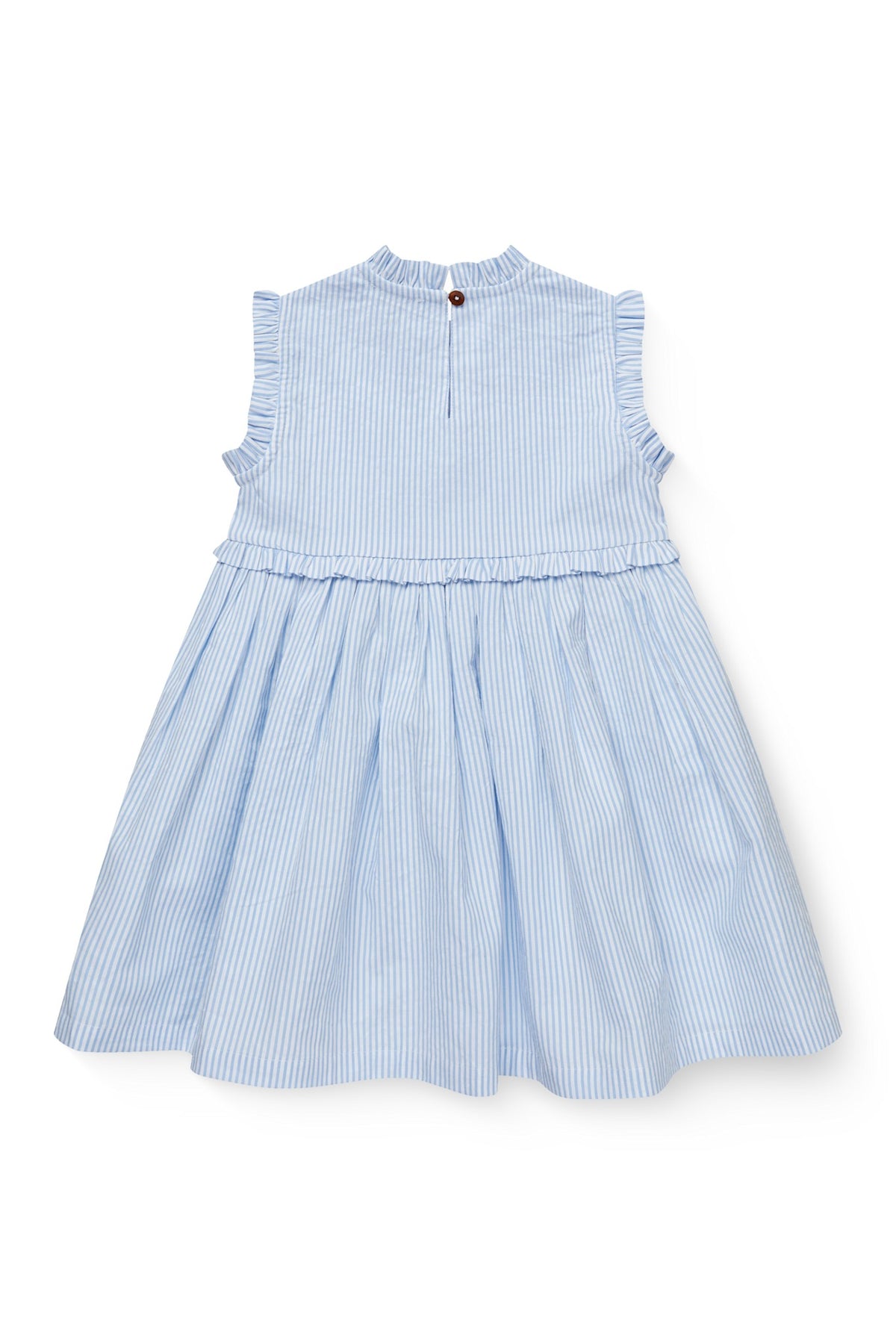 Elegant and timeless, this beautifully detailed dress is made from 100% GOTS-certified organic cotton, combining softness with sustainable quality. The delicate striped seersucker fabric is detailed with embroidered rose motifs across the chest, adding a touch of sweet elegance.