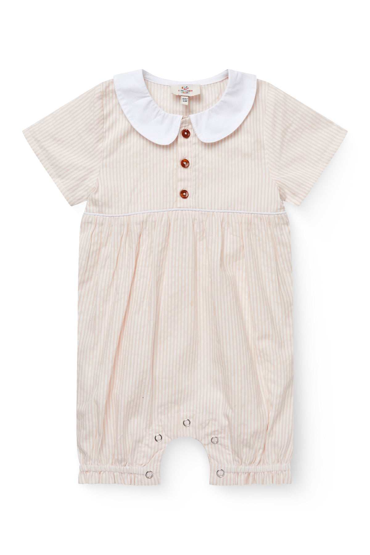 Made from 100% GOTS-certified organic cotton seersucker, this romper features a classic striped design with a contrast Peter Pan collar and button placket. Soft, breathable, and thoughtfully detailed with elastic cuffs and snap closures for easy dressing.