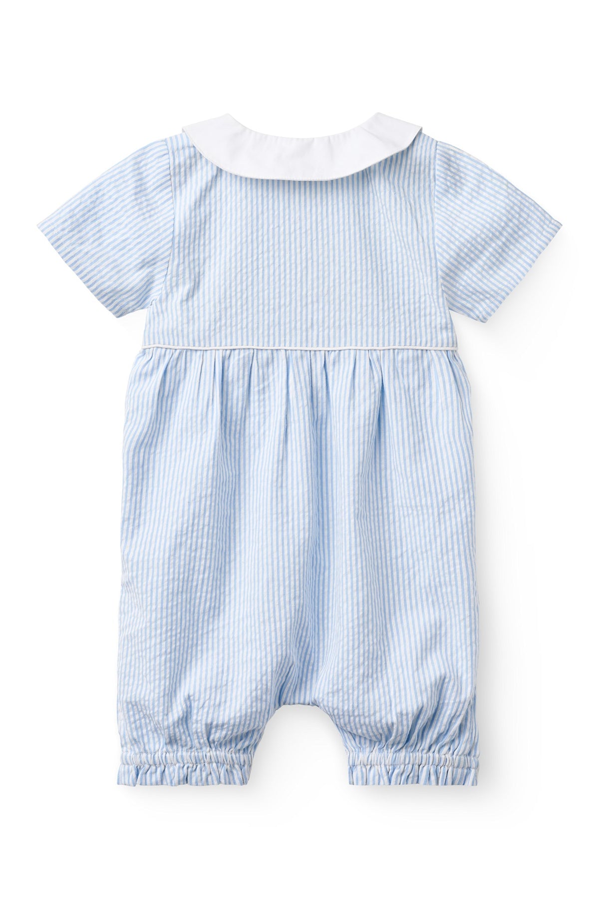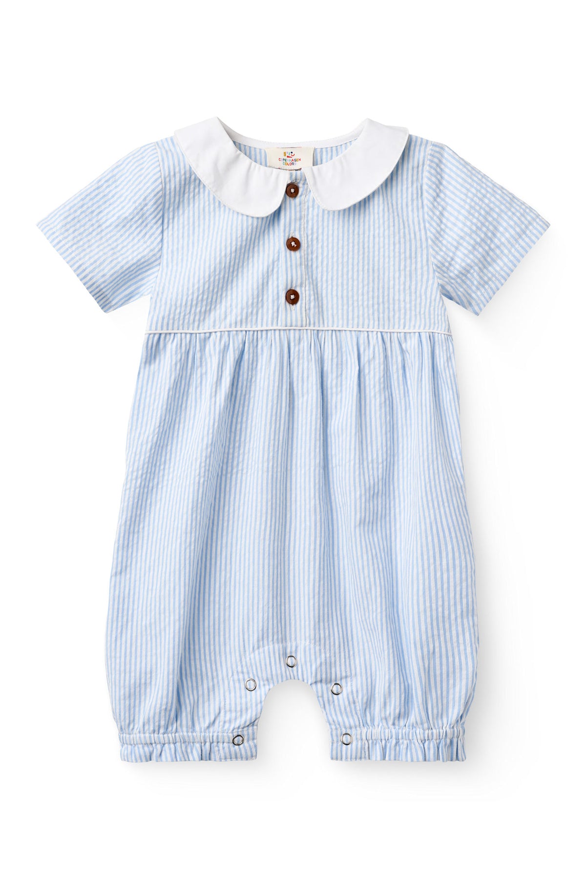 Made from 100% GOTS-certified organic cotton seersucker, this romper features a classic striped design with a contrast Peter Pan collar and button placket. Soft, breathable, and thoughtfully detailed with elastic cuffs and snap closures for easy dressing.