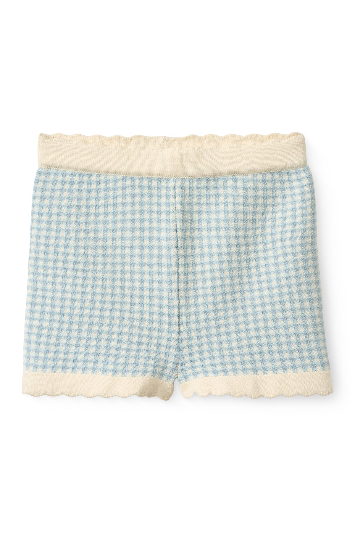 These soft knitted shorts are made from 100% cotton, offering comfort and breathability for everyday wear. They feature a light classic gingham pattern, a stretchy waistband for a snug fit, and delicate scalloped edges. Perfect for pairing with a matching top or a simple tee on warm days.
