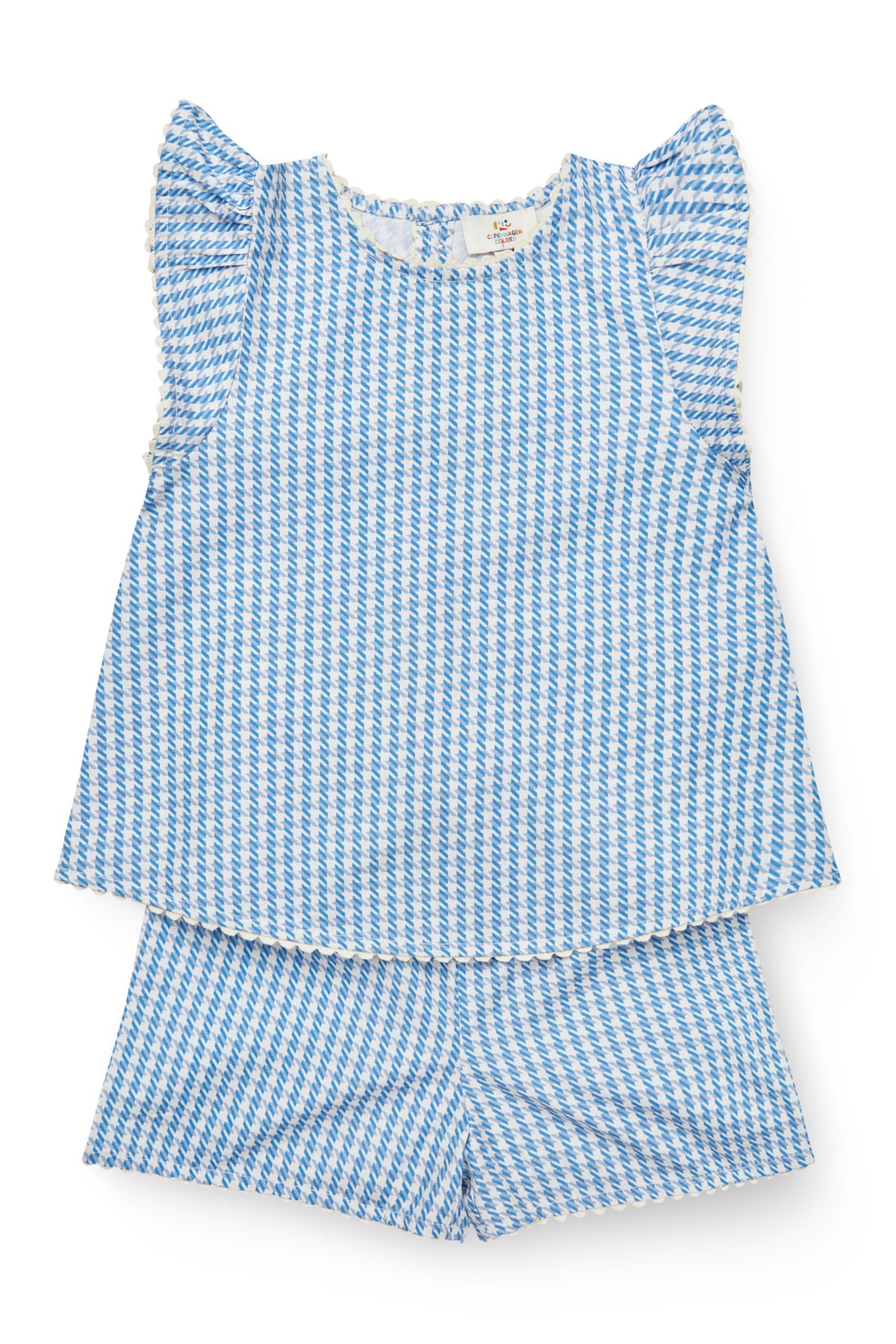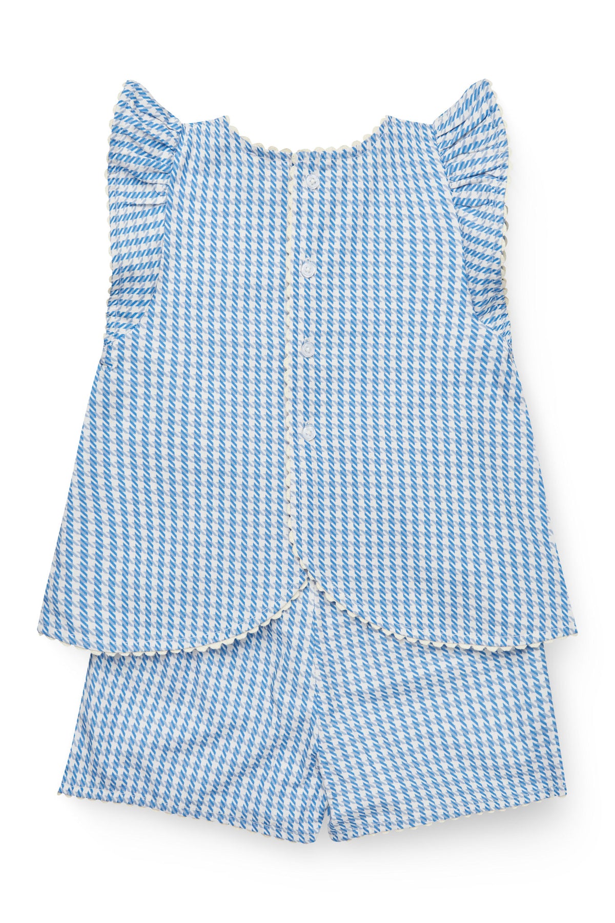 This adorable set includes a sleeveless top with delicate ruffled shoulders and a matching pair of shorts, both in soft houndstooth fabric. The top features a scalloped hem, fabric-covered buttons down the back, and sweet trim details along the edges, giving it a light and playful look. Made from 100% GOTS-certified cotton. Available in two colors: Blue Houndstooth Pink Houndstooth.