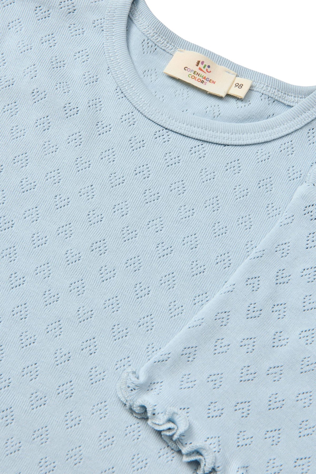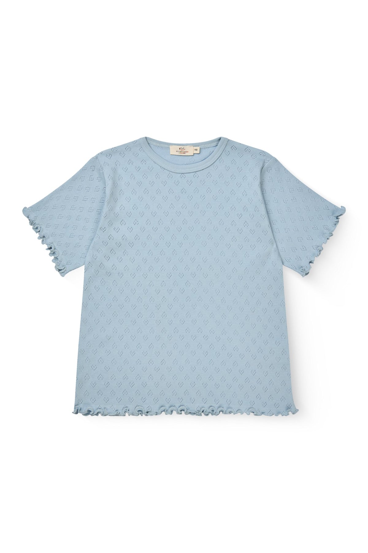 Pointelle tee made in organic cotton. Designed with a short sleeve and a babylock edge at sleeve and bottom hem, for that cute summery look. The light pointelle with the small hearts is made in a super soft jersey quality and comes in 4 different summery shades; cream, light rose, a fresh light yellow and a classic navy. Wash it again and again at 40 degrees and it never loses its shape. No lint and fading colors will be limited. Made in various colors… Of course.
