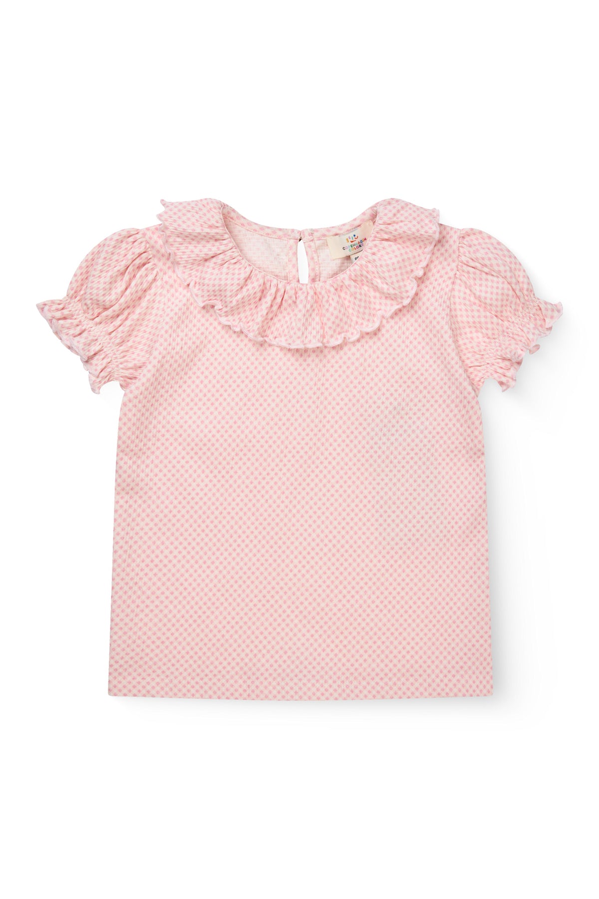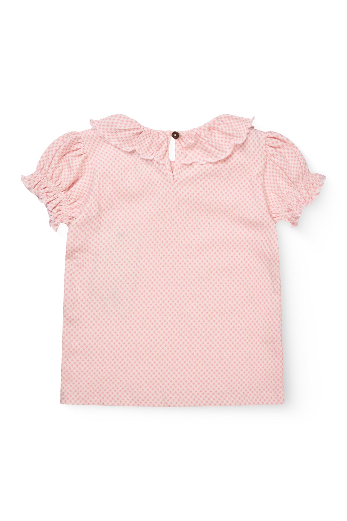 It features charming puff sleeves, a frilled collar with delicate edging, and a keyhole button closure at the back.