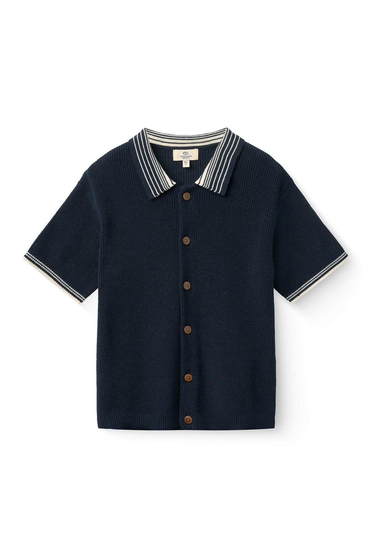 This short-sleeved knitted shirt is made from 100% cotton, featuring a textured knit and front button closure. Designed with a classic collar and ribbed edges for a neat finish, it offers a relaxed yet polished look that’s perfect for layering or wearing on its own.