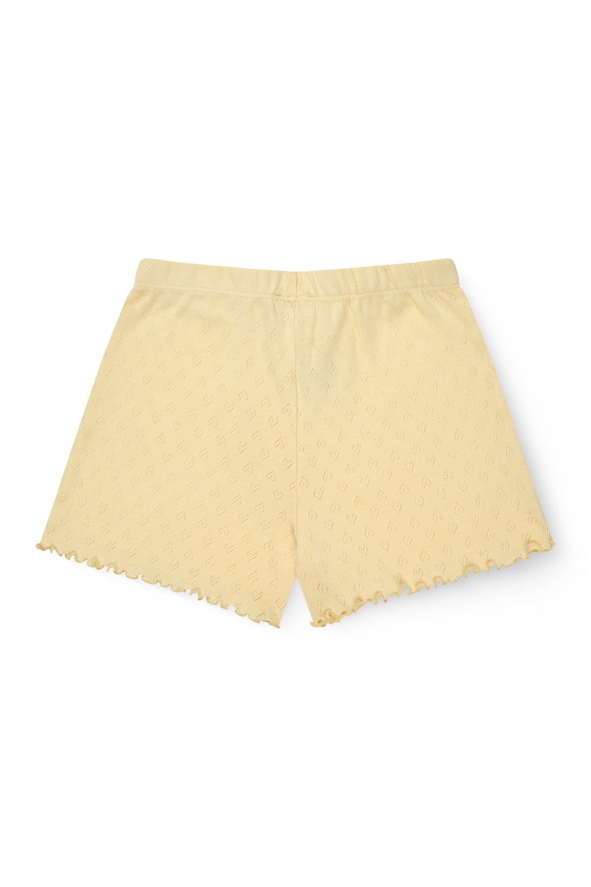 Pointelle shorts made in organic cotton. Designed with an elastic waist for comfortable wear and a babylock edge at bottom hem, for that cute summery look. The light pointelle with the small hearts is made in a super soft jersey quality and comes in 4 different summery shades; cream, light rose, a fresh light yellow and a classic navy. Wash it again and again at 40 degrees and it never loses its shape. No lint and fading colors will be limited.